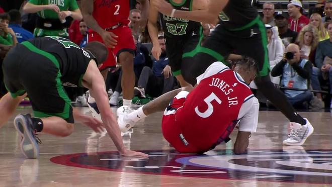 从视频回放中可以看到,当时小琼斯持球过半场,普里查德尝试抢断,结果两人都摔倒,普里查德扑球时疑似压到了小琼斯的腿部,后者显得极为痛苦,一直抱着腿,双手还砸地板。